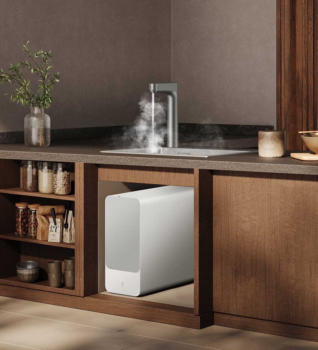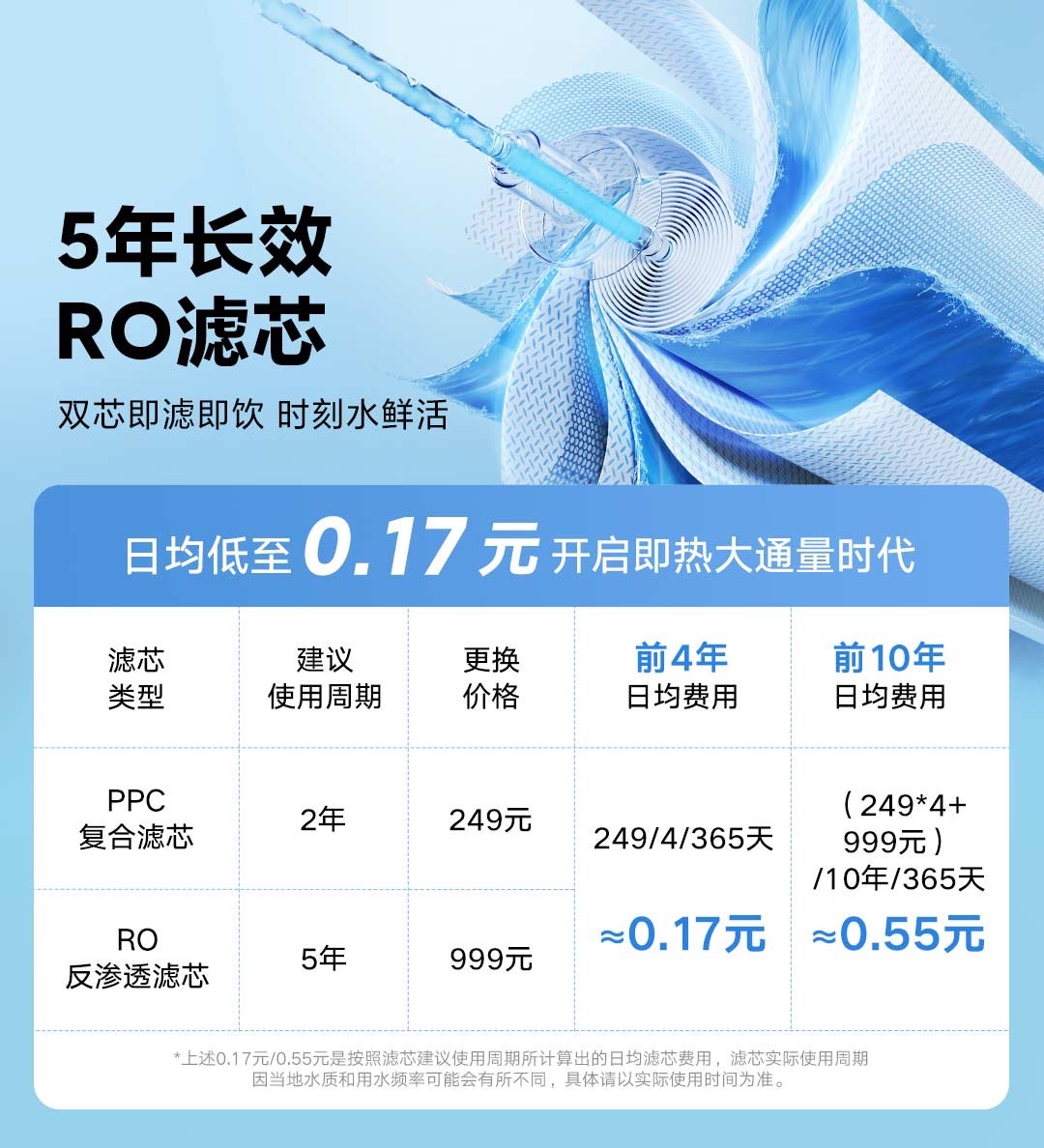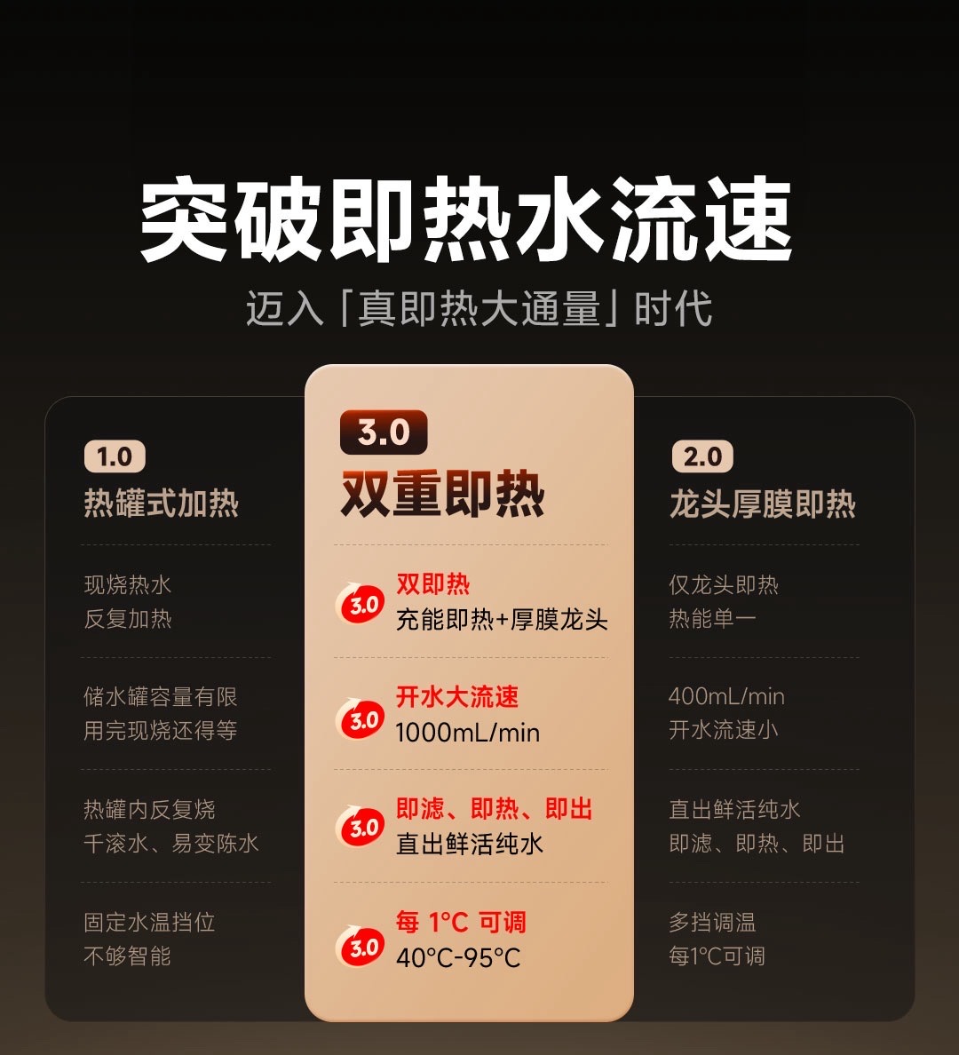 当然也可以选择带即热功能的净水机,例如小米Q1000,支持热水直出、无陈水。
