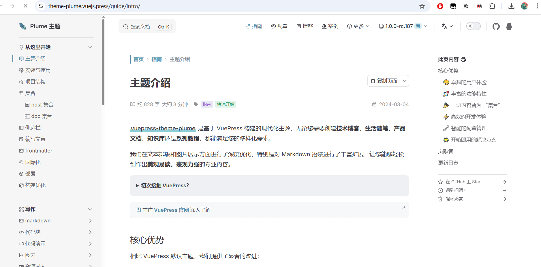但我脑海里一直都在构思一个“文档”形式的网站,它的内容排序不是时间流,而是优雅的侧边栏和简洁的Markdown文本作,内容强关联、成体系地展现出来。很快就发现了vuepress这个项目,完美的命中我的需求,左侧是索引性质的侧边栏,中间是简洁的内容,右侧是本文的目录。